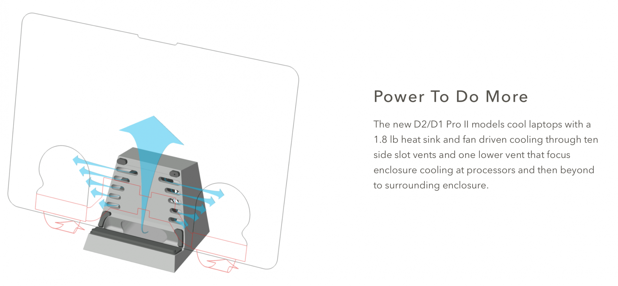 As shown in the SVALT laptops page, Apple removed the center air intake vent with the 2016 MacBook Pro. No current generation Apple laptop has an air intake vent located next to processors and that supports direct internal cooling. The new Cooling Dock Pro II models include passive and active cooling optimized for current generation Apple laptops, as well as many PC laptops that use a similar built-in cooling system. The support and cooling system is also designed so that it is more likely to be compatible with future generation laptops. The Pro II’s passive cooling system features a 1.8 pound aluminum heat sink located next to laptop processors that absorbs heat through line-of-sight radiant heat transfer. The Pro II’s active cooling system features ten side vents that drive cooling air onto the laptop’s metal enclosure at the processor location and then sends cooling airflow to the sides of the laptop enclosure. The side vents combine with cooling airflow from a lower vent that drives cooling air at the laptop enclosure’s central processor location and then sends air upward along the laptop enclosure. Raised laptop pads direct airflow for optimal cooling, as well as house the D2’s laptop temperature sensor. Pad size is minimized to reduce contact area on the laptop, reduce heat trap and maximize cooling. The managed airflow helps generate more efficient and quieter cooling.