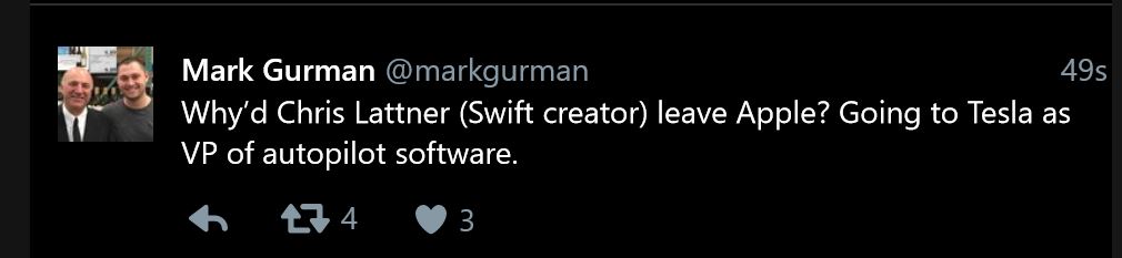 And its comments like these that show you shouldn't comment until you actually know where he was going. He's going to Tesla to be a VP of autonomous software. If you think he is going to be hammering out tons of code for Swift you are beyond delusional.