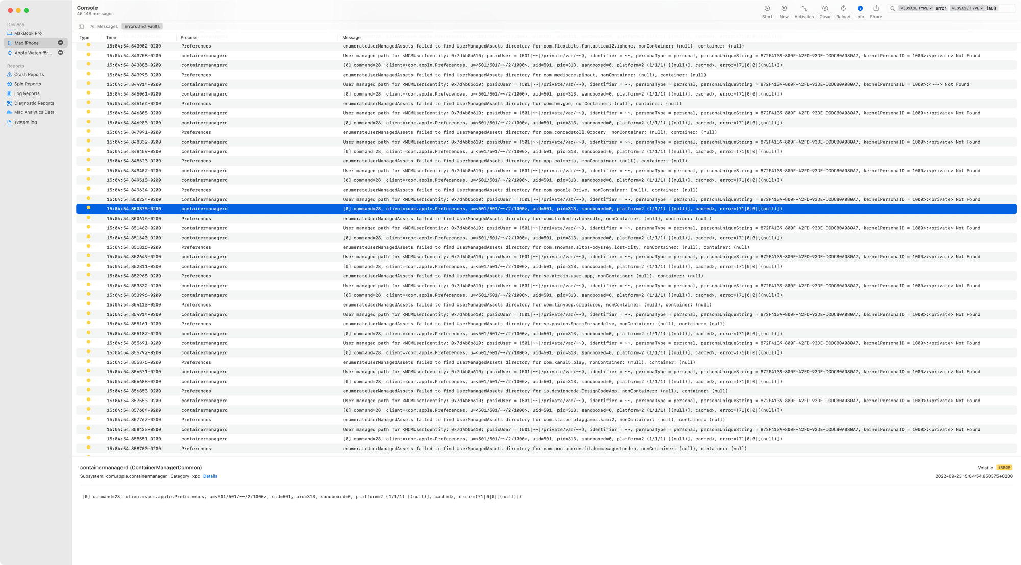 I also tried looking at console messages in Xcode, I’m no developer, but it seems to be errors related to syncing of apps.