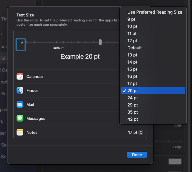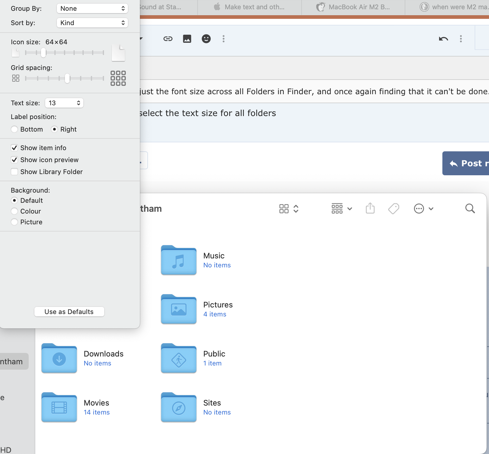 I am once again endeavoring to adjust the font size across all Folders in Finder, and once again finding that it can't be done. But we went to the moon over 50 years ago using a computer with less computing power than the first iPhone... or so the story & the tall tale goes. Right. So why can't Apple increase the Font size across all Folders?