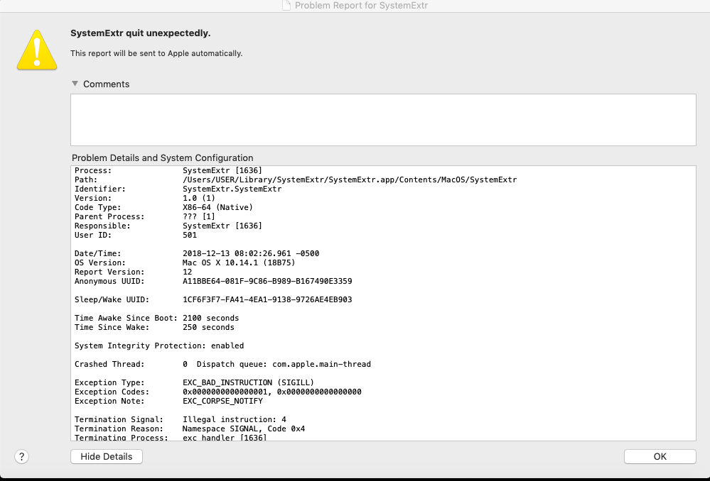 chrfr macrumors G5 Jul 11, 2009 13,975 7,753 Dec 14, 2018 #4 Polekat said: Ok, I may have fixed it. In case anyone else has this issue, this seems to have fixed the issue https://apple.stackexchange.com/questions/345576/systemextr-quit-unexpectedly Click to expand... Again, this is likely some sort of adware. You may have removed this particular application but there may be more. I still suggest using Malwarebytes.