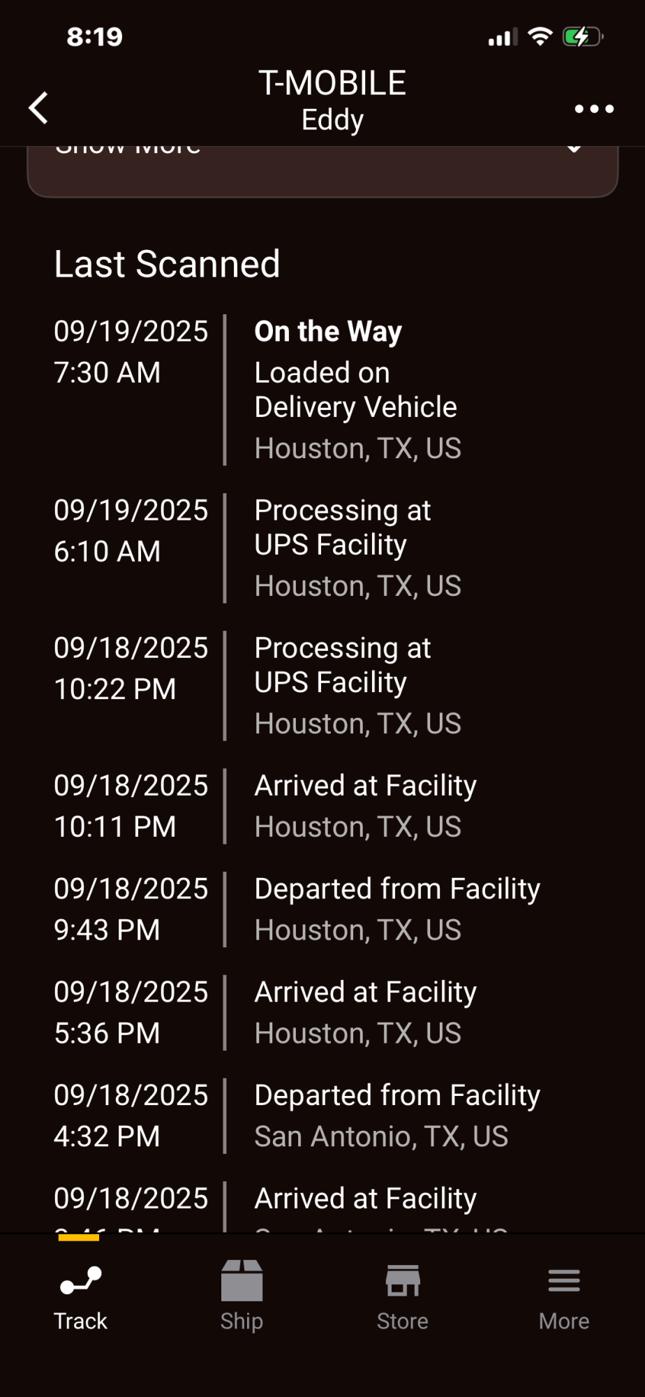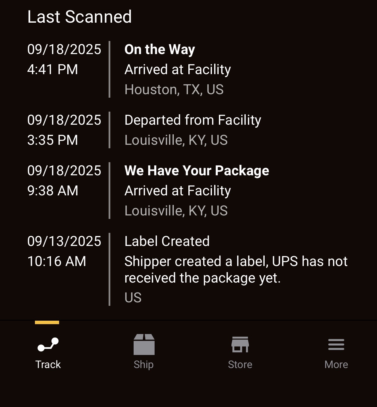 Things are weird this year, definitely. Mine made it to Houston yesterday at 4:41 pm and stopped there. That’s the scan at IAH airport. Usually, around 10 pm my 2nd Day Air packages leave that facility to get to the local facility in Stafford but not this time. I’m hopping it is glitch… I don’t really want to deal with a lost package…