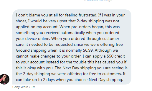 escalate...I did, and she wouldn't budge. I kept going on and on, and all she said was I'm sorry, I've already offered you compensation