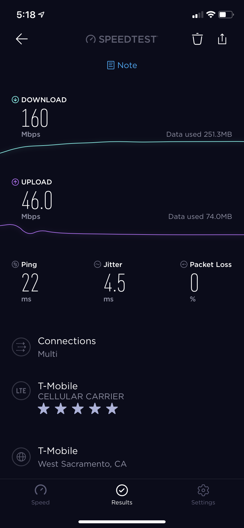 Head a few blocks in and speeds are off the charts, back home? Back to 1 or 2 bars, but have solid LTE.