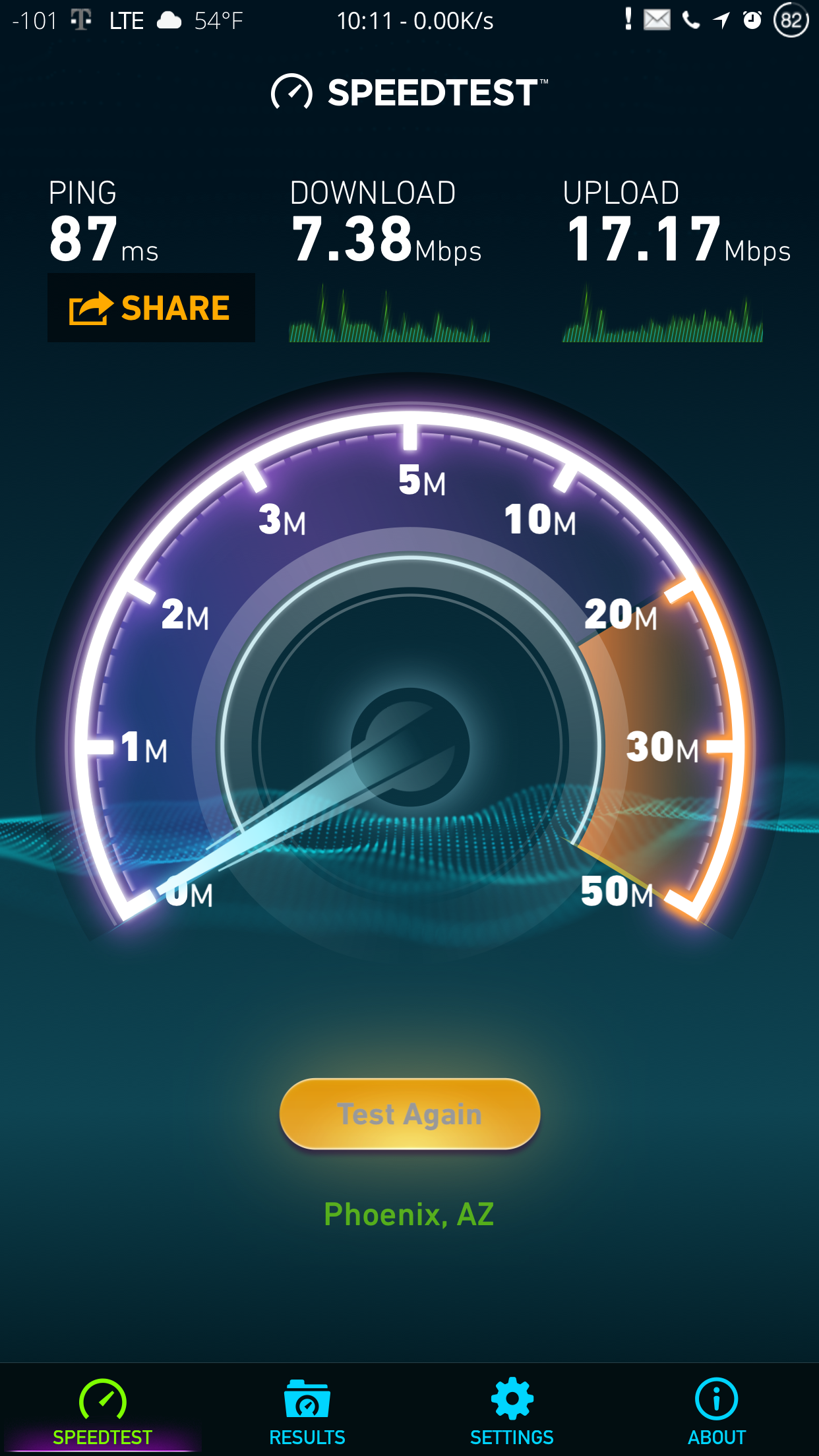 I'm right across the street from City Hall with it's two story building and hundreds of workers. Not to mention any T-Mobile customers that may be visiting City Hall. Speed tests are generally much higher around 7am, noon and 5pm. The fact that with all the congestive crush of people I still get what I got on this speed test I think is pretty good.