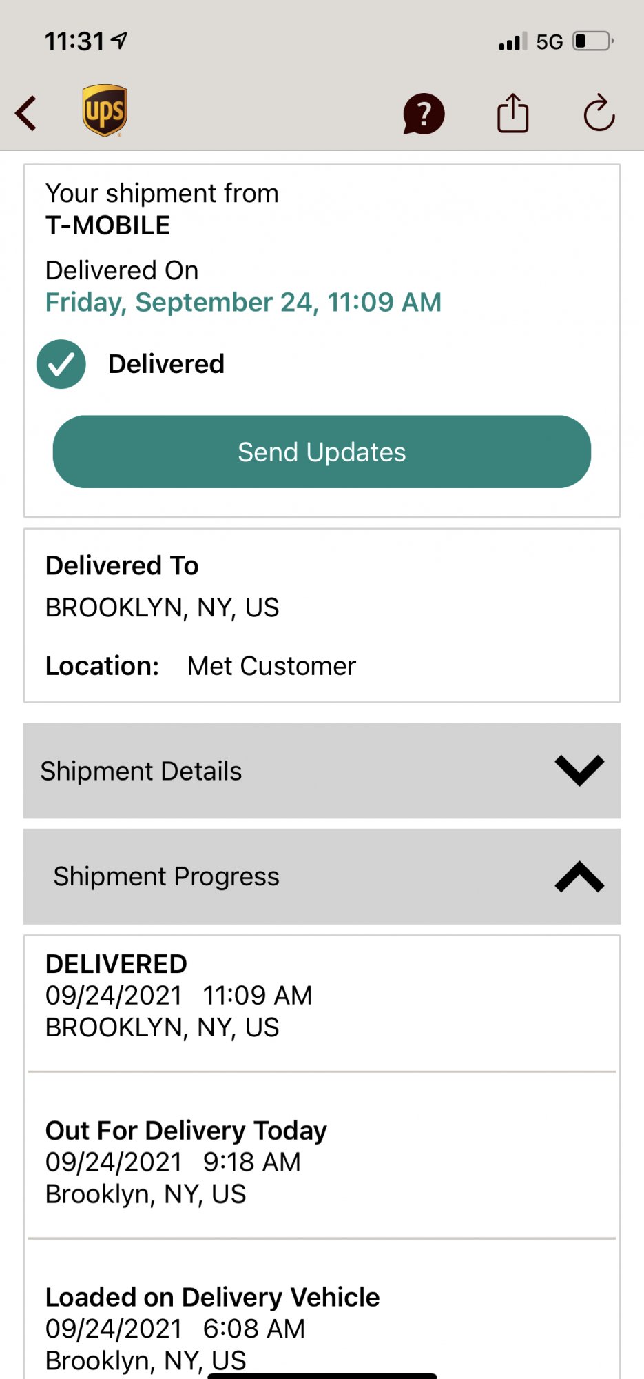 UPS just sent me new status that iPhone is out for delivery. Put on the truck 9am local time (PST).Latest update from T-mobile and UPS is that iPhone shipped out of Jeffersonville, IN Thursday night and is scheduled for delivery on Friday, 9/24, between 5 to 8 pm, PST. I live in the Antelope Valley in SoCal. Not sure I will get that fast though. Things have a way of getting held up in LA or Ontario with late arrivals.