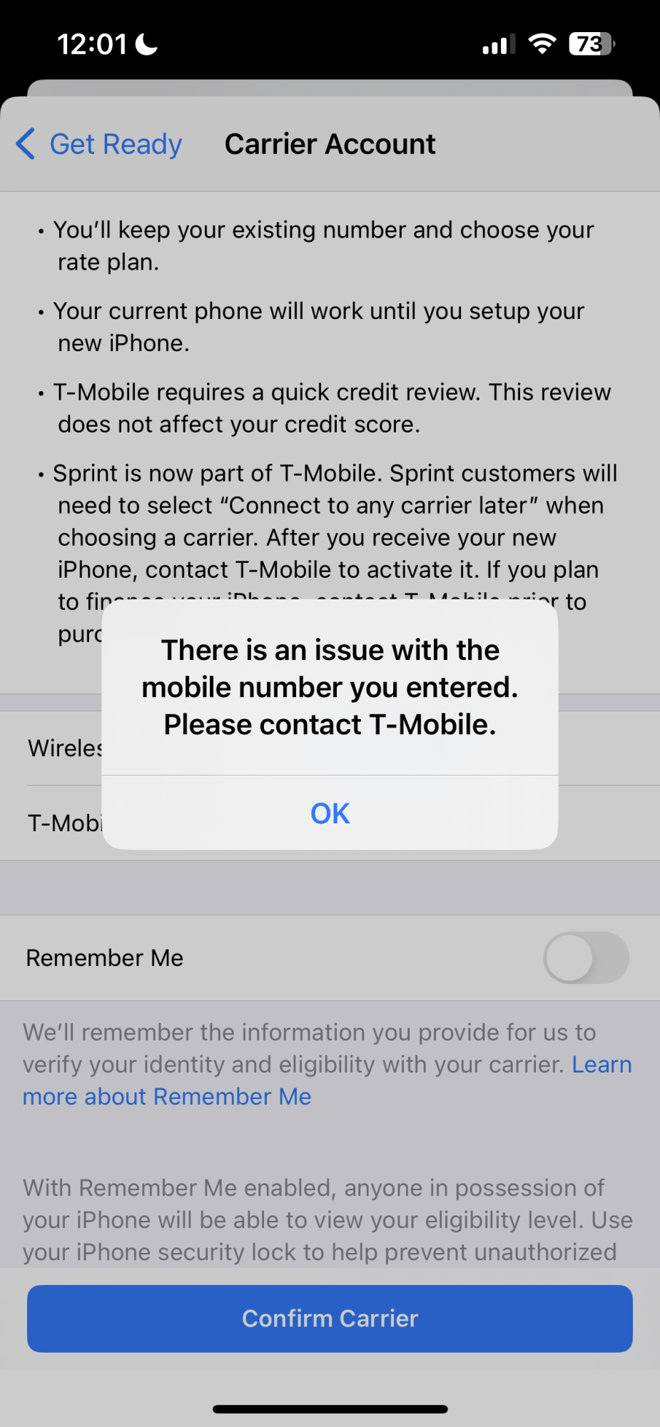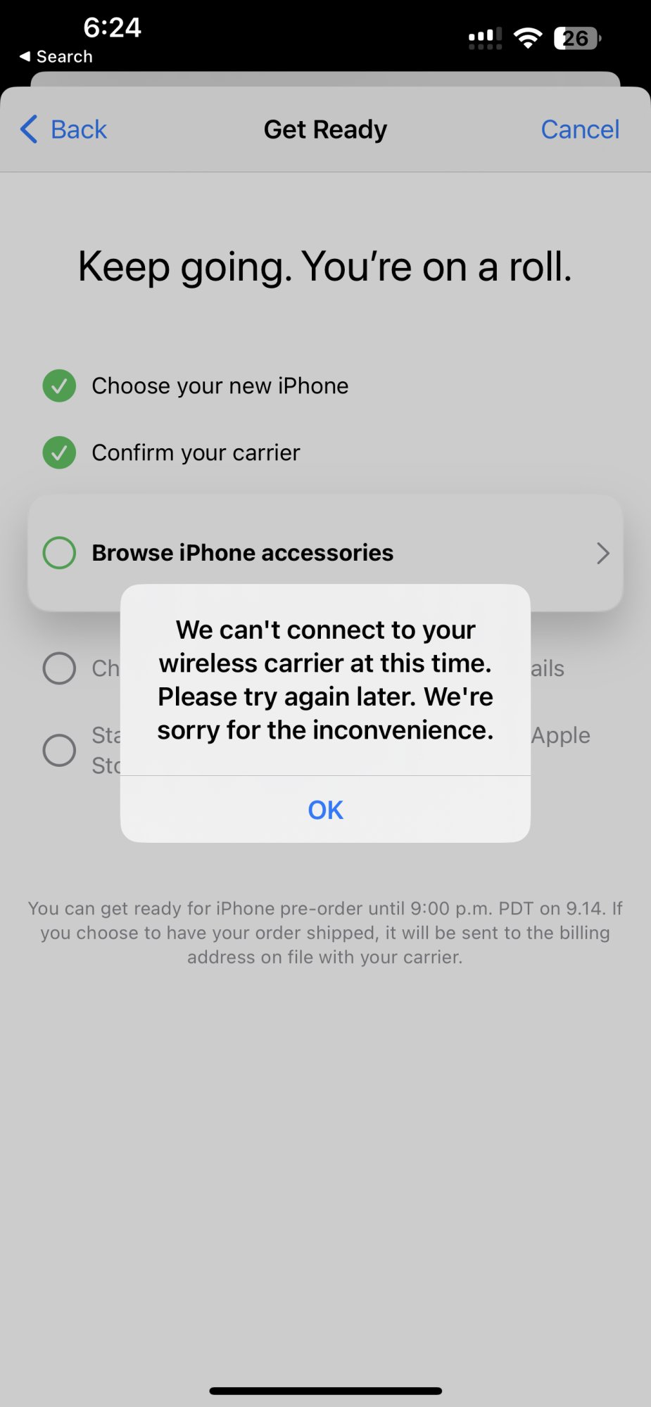 Been experiencing this since yesterday. However, I moved T-Mobile yesterday.I'm getting this error message when I try to pre-preorder. Both on Apple Store app and on the website. Anyone else experiencing this?