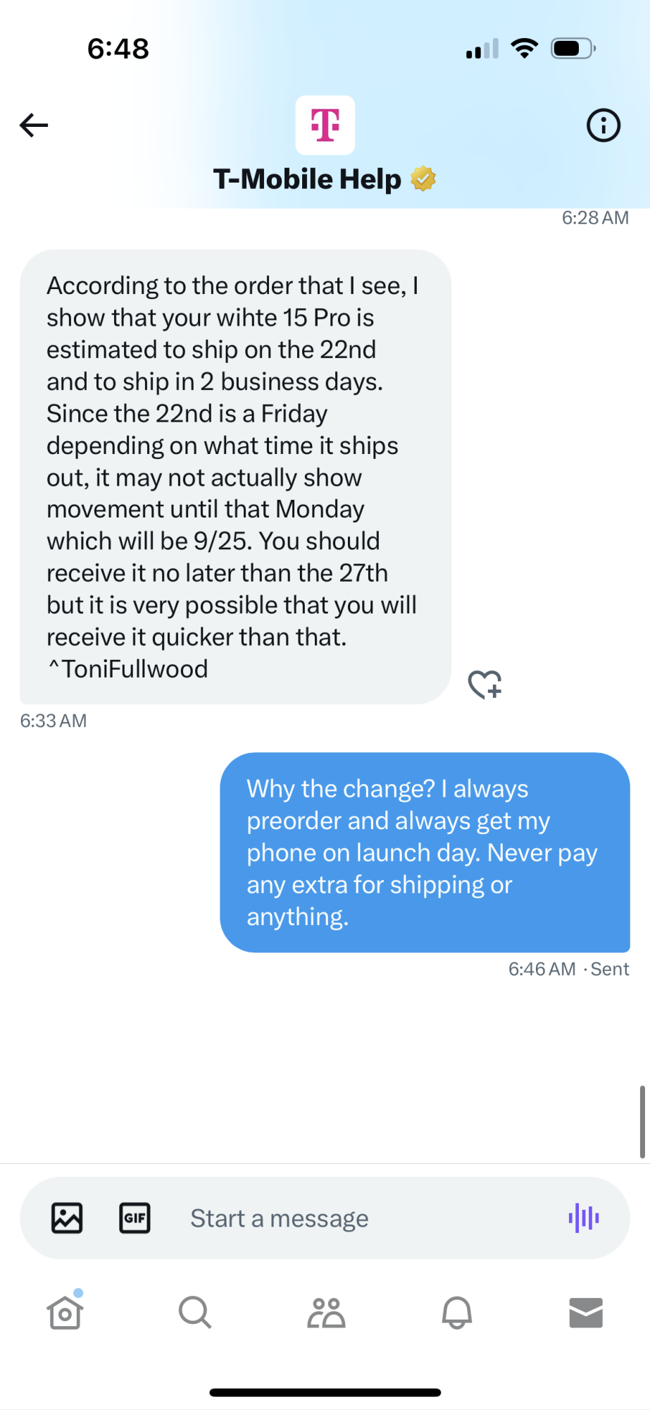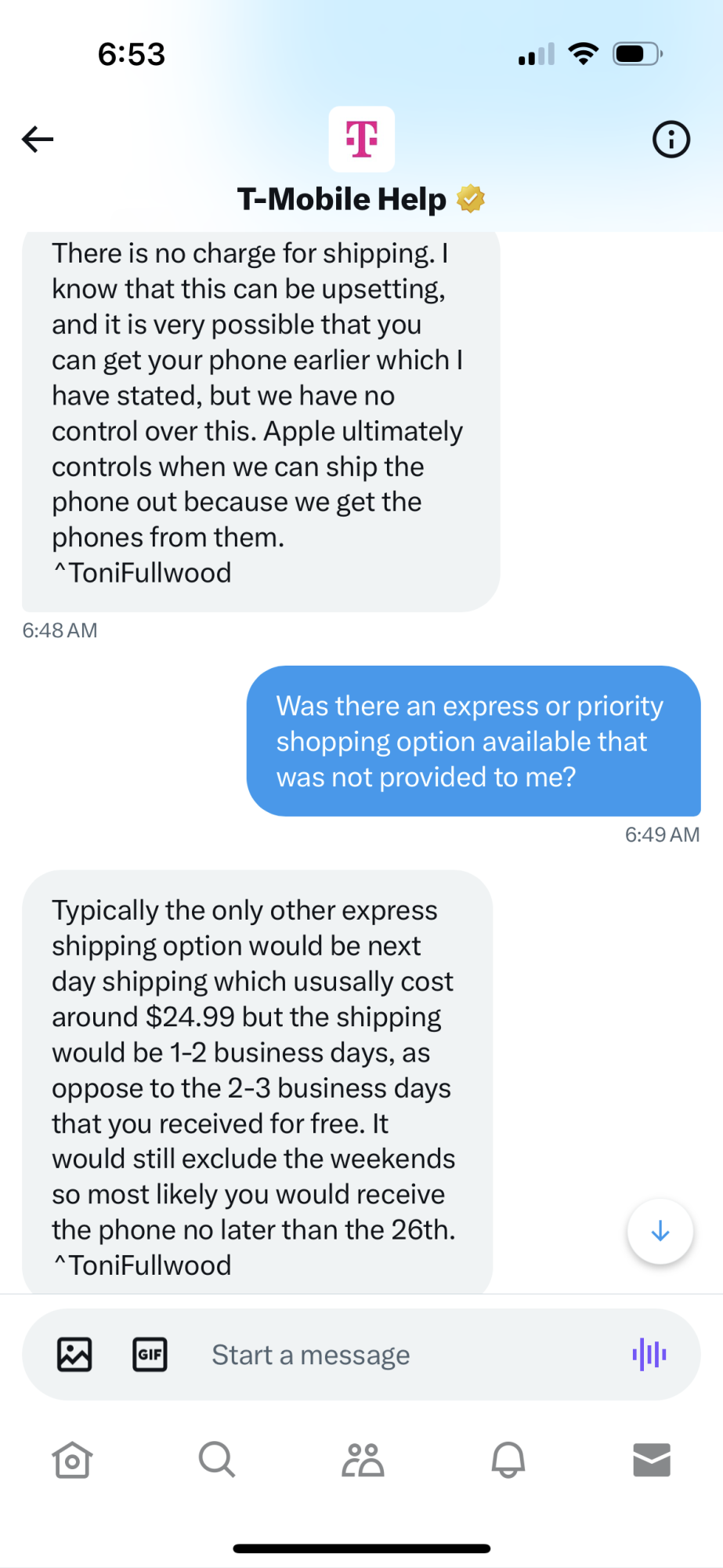 Switched to T-Mobile, app was a total bust. Tried on the website using my phone, got all the way to the last page of checkout, and the buy button was grayed out.
