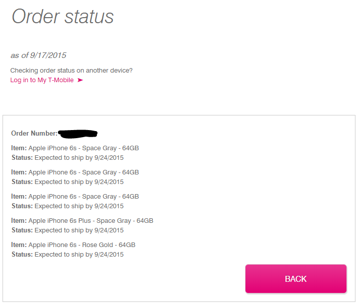 Well, I just got off a a 40-minute phone call with T-Mobile, because I was getting the "Orders are not visible in this tool until 24 – 72 hours after they are placed. Please check back tomorrow to view your order status." on the status page.