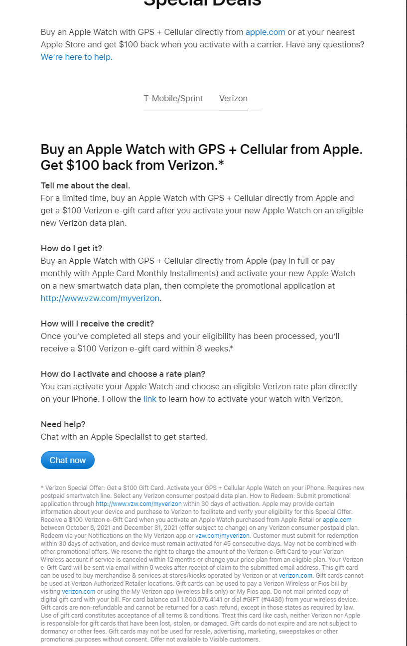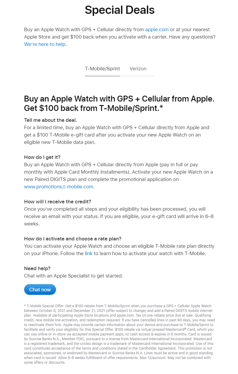 By activating $10/month unlimited data plan for smartwatches through T-Mobile, you should be able to apply 2021APPLEWATCHRETAIL1 promo code at T-Mobile's promotions redemption page. You should get $100 prepaid MasterCard 6-8 weeks later, at which point you can downgrade to $5/month 500MB data plan for smartwatches or even cancel the plan altogether.Customers can buy Apple Watch (GPS + Cellular) directly from apple.com/store or at an Apple Store and get $100 back when they activate it with T-Mobile/Sprint or Verizon.