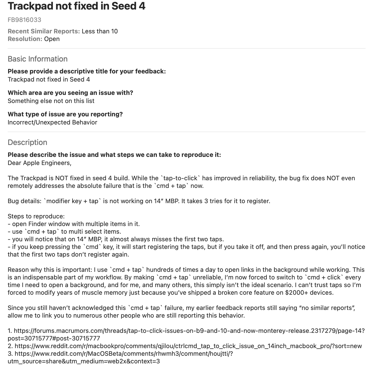 Great idea!Can we have an article on the website about this ? I feel like it’s the only way now to put some light on the issue. We wrote enough feedback. The lastest I wrote with cmd + tap not working on the title and the one with trackpad still not working on 12.1 both are saying zero similar reports.