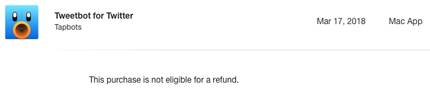 Exactly. And they suggested people to refund version 2 and buy version 3. But iTunes refused my refund request. They have waited long enough so that the people bought when Twitter closed down their official app cannot get any refund.Normally I'd agree, but the timing just seems pretty gross. They discount Tweetbot 2 because Twitter for Mac goes down, and then launch Tweetbot 3 weeks later. Seems like they're betting on people that had to migrate having to buy both - which is the boat I'm in now.