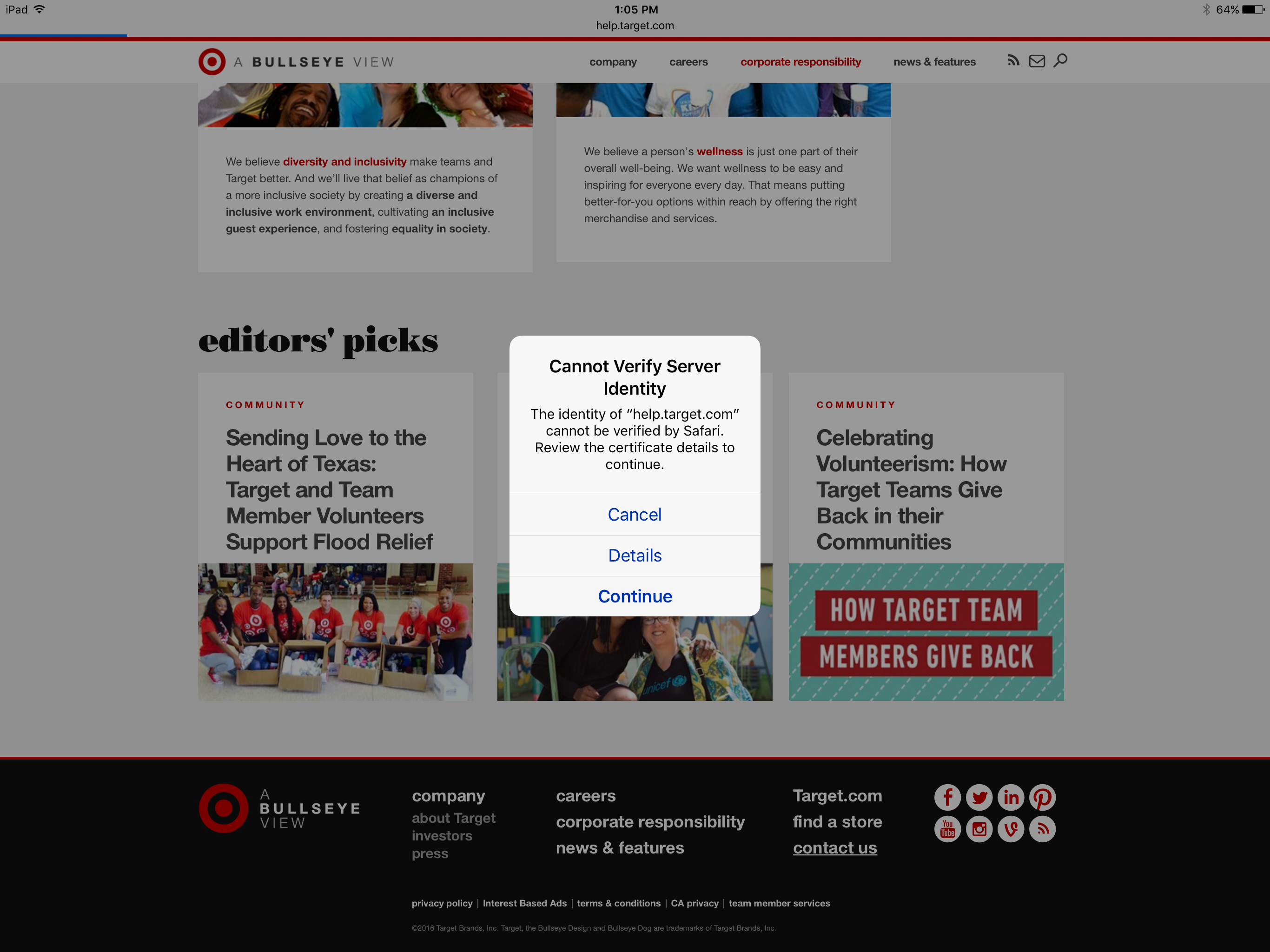 I went to Target's website yesterday thinking I might order something and was met with a trust certificate warning. I was on my Macbook pro retina running 10.11.5 using Safari (up to date). Saw the message below when trying to access the home page. Not savvy about this kind of stuff and was surprised to find this pop up on a large retailer's site. We were caught up in Target's massive hacking a while back, know they were trying to recover public trust and beef up security and so found this especially surprising. Could not find anyway to contact corporate to ask about the website security, and even the local store I called had no way of telling customers how to contact them. They just said "well use it or don't". Comments? Should I not be using their website essentially?