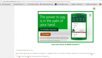 Just one month before Apple Pay is rumored to launch in Canada, large bank TD Canada Trust briefly provided evidence of the forthcoming launch by prematurely listing the iPhone-based mobile payments service as a method of payment on its website, as spotted by blog iPhone in Canada. The link has since been removed.