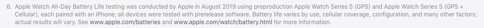 Case in point: Apple claimed major battery life improvements on the iPhone Max Pro. This is absolutely true and it was true even with the mess that 13.0 was. Apple made these claims for the OS the watch was running on, not the OS that is coming at some point down the road. iOS 13 has been a very buggy release (hence the massive amount of updates we have seen). One thing that was true on day 1 was the stellar battery life regardless of the mess the rest of the OS has been for some people. I don't know why people assume the same wouldn't hold true for the watch. Apple tested the watch on 6.0 and made the claim of battery life based on 6.0.