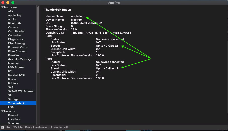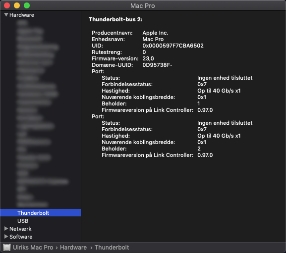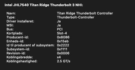 Seen as follow: 40gb/s x1 seen by the system slot 4 but also 3. Impossible also to mount drives etc etc even rebooting to recovery twice nada nothing i can't get a thunderbolt cable connected to a SSD drive as well