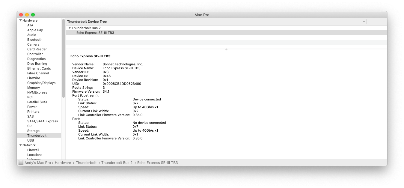 Final experiment with the Sonnet chassis for now; it would appear that the Titan Ridge 2.0 does correctly identify different cable connections. The cable I have that reaches to where the chassis lives is 20Gb/s, while the one supplied in the box is 40Gb/s, but too short. While I have the thing out for testing I tried the short cable.