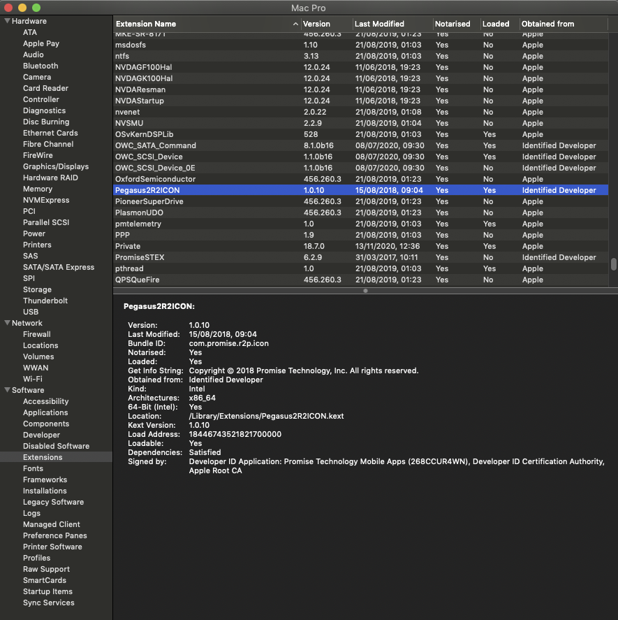 So, there are two extensions in the system I can see. The Pegasus2R2ICON.kext which says it's there and not loaded until I do a restart (doesn't load from a shutdown and restart). And the second one (as you suggested) PromiseSTEX.kext is not loaded at all. My Titan Ridge II is set up by the guys at Create.pro (Macfinder) and I have an OpenCore 0.6.3 installed with the OpenCore Configurator app on my desktop. Would you know what I need to do to try and load this extension?