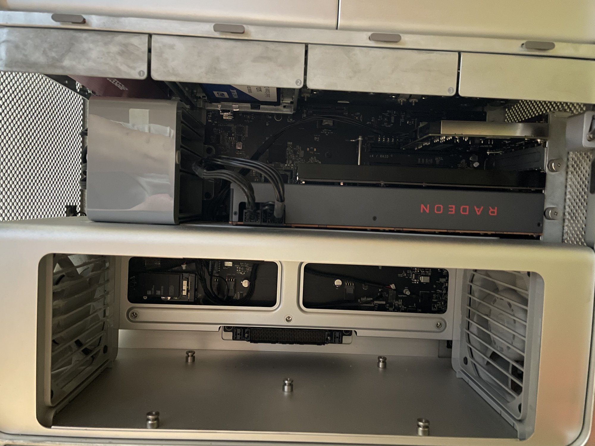 The only USB-C and/or Thunderbolt devices I have on hand are (1) external SSD enclosure with dual SSDs (USB-C), (2) Pegasus2 R4 connected to TB2->TB3 adaptor. I've also tried the card with (3) charging my 16" MBP, which works, (4) connecting my iPhone 11 Pro Max and iPad Pro 12.9" via USB-C. Charging works, but Catalina doesn't detect my devices in Music/Finder. My external SSD lights up, then the power LED goes black. When plugged into my 16" MBP, the light behaviour is similar at the start (solid light on for 2s or so), but it would then flicker green if it works. On my MP5,1, it stays black; no volume mounts.