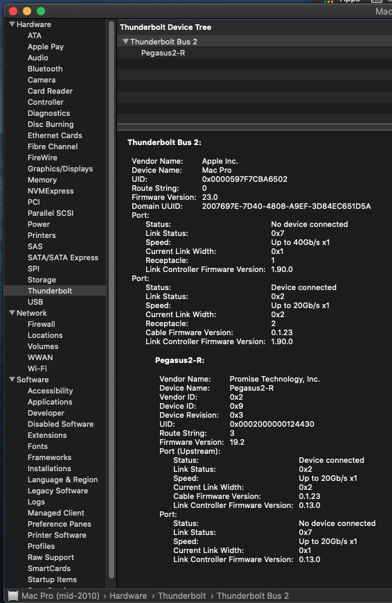 The funkiest behaviour is reserved for my Pegasus2 R4. At first, after installing the Promise Drivers and Utility, and using Kext Wizard to install the "PromiseSTEX.kext" file, my Catalina refuses to start - black screen after Apple logo. I then reboot into Mojave to "sudo rm" the incriminating kext from my Catalina volume. Prior to attempting the kext install, connecting the RAID box to either USB-C ports 1 or 2 causes my display to black out before my RAID box loads (orange light to blue, disk flashing blue), and then enter an infinite loop of reboot-error.screen.press.key.or.wait-reboot weirdness. After I removed the kext, Catalina strangely recognises the RAID box without any screen blackout, and I see this.