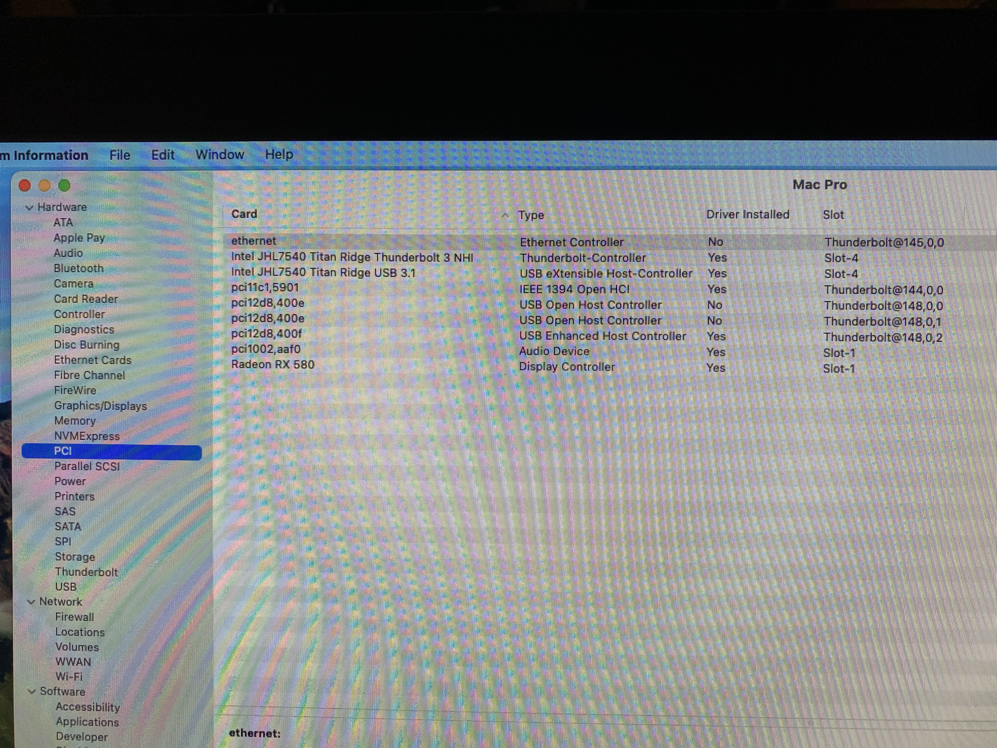 Display ethernet will light up switch/router side led. But SystemPreferences->Network does not show Display ethernet but has an entry: thunderbolt bridge. System Report on PCI show ethernet entry has no driver (see picture 1).