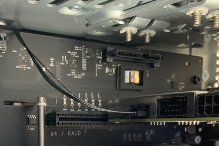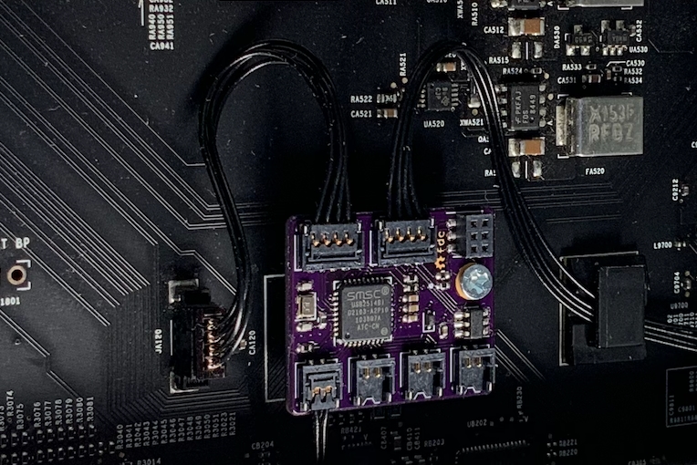 The module provides four internal USB data connections: one for the BT module, two for the GC-TITAN RIDGE, and a spare (pictured above, only the BT connection is used). It also provides GPIO for the GC-TITAN RIDGE (see above on the right). To the best of my knowledge, this is the first active add-on module for interacting with a Thunderbolt card through the THB_C header. The module not only takes care of FORCE_PWR but also detects SLP_S3 to reset one of the PD controllers for proper wake-from-sleep behavior. As a result, my LG UltraFine 5K display no longer stays black when my Mac Pro wakes from sleep!