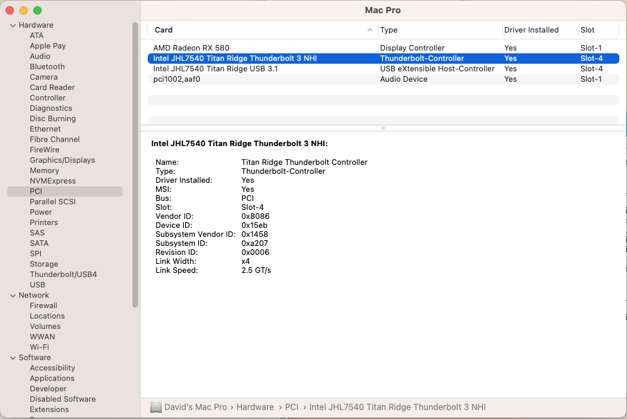 - I am able to see the card in System Report > PCI (Listed as Intel JHL7540 Titan Ridge Thunderbolt 3 NHI) and the associated USB 3.1