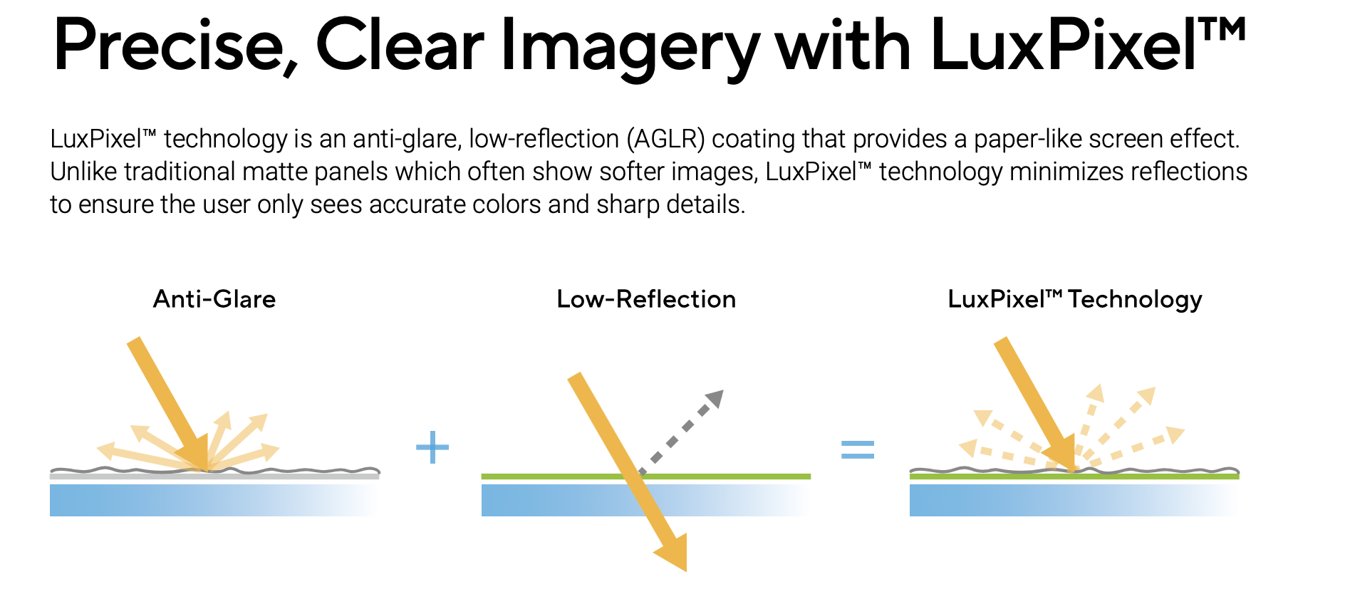 Thanks for this! I was intrigued by the display because they claim to have a coating that doesn't soften the pic as much as a traditional matte coating (see below), but from what you wrote that's clearly not the case.