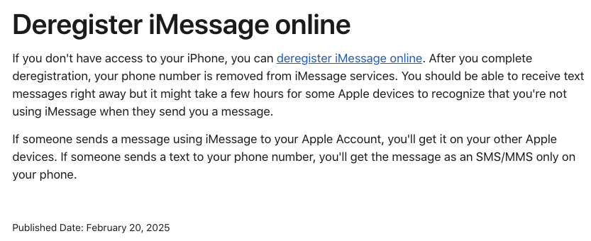 southerndoc Contributor May 15, 2006 1,956 586 USA Sep 7, 2025 #3 circatee said: Found an answer, I think... View attachment 2544340 Click to expand... That seems fishy. Deregistering iMessage online?