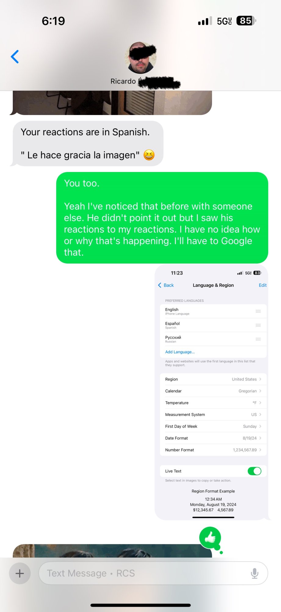 Below are two screenshots, one is of a text exchange with a bilingual friend who informed me that my reactions are going through in Spanish, the second is the same as the first but I zoomed in on the part which shows my language setting.