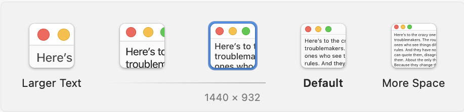It's slightly confusing now, as the resolutions are all custom for the liquid retina display size/ shape, but effectively if you want the perfect retina scaling where 4 physical pixels act as one 'looks like' one, text and objects on screen will look bigger on both the 15 and 13 inch MacBook Air than they will on the 14 and 16 inch MacBook pro.