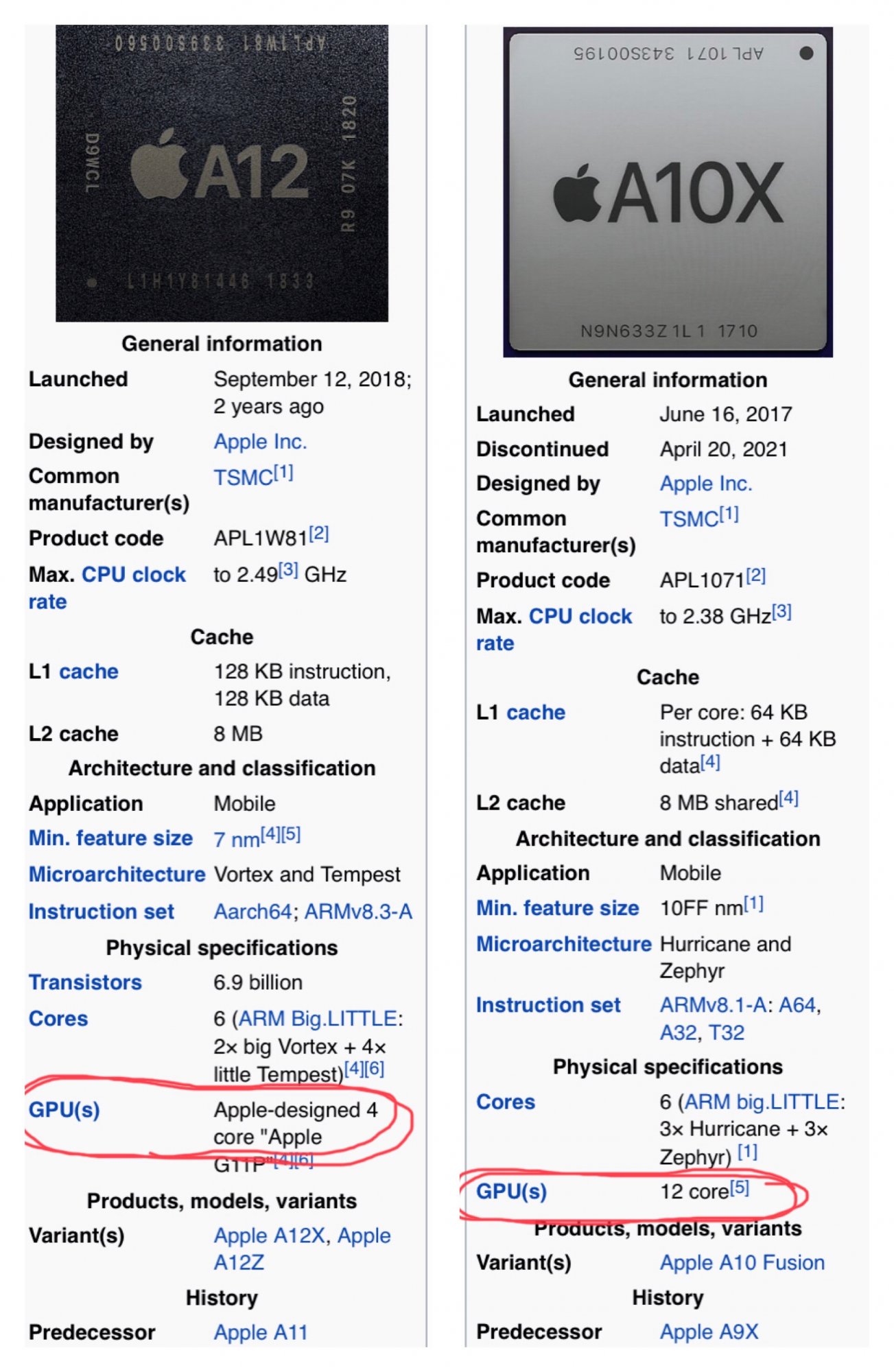 The GPU core count above is a bit of "Apple's to Oranges". The baseline of the A10 era SoCs still had a design mainly based on Imagination Technology GPU ( PowerVR) . Apple had replaced bits of the overall implementation but it was still in the phase where was trying to appear as a ImagTech GPU. At A11 Apple shifted over to doing their own more explicit implementation. When they did they changed the appoarch of how they count 'cores'. So in realm of comparing AMD 'CU's to Nvidia ' CUDA cores'.