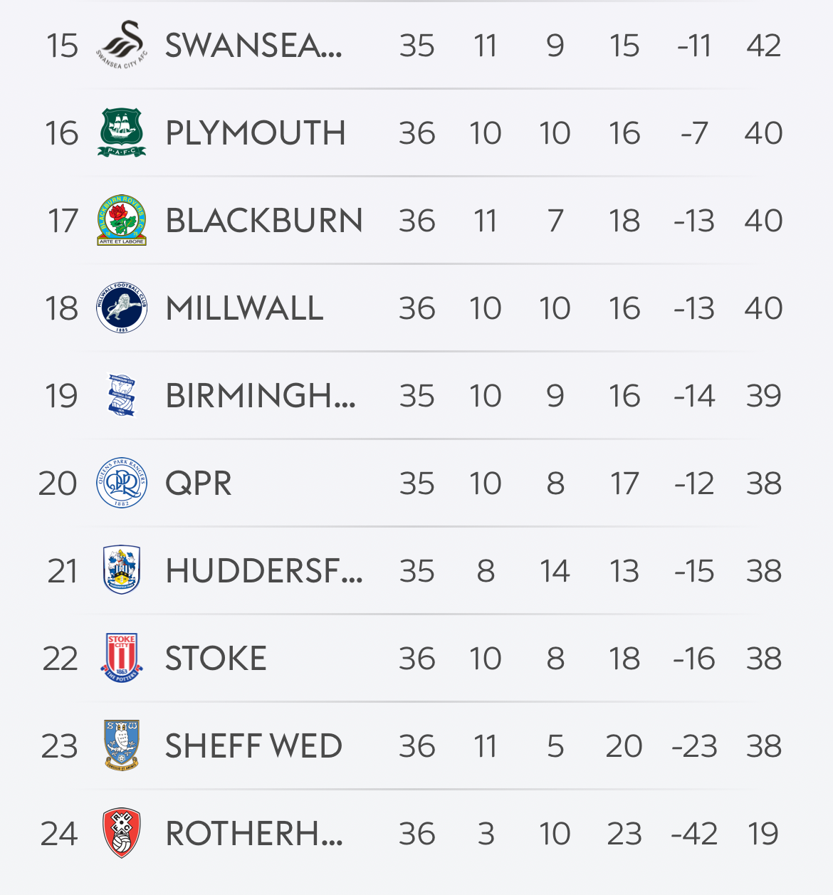 Looking at the table, considering Sheff Wednesday have lost more games than anyone else, the odds are not in their favor. The surprise in that bunch for me is Huddersfield. With only 13 loses, that would normally have put them middle of the table but they are in a relegation battle due to drawing too many of their games.One win from safety! The bottom of the Championship is so close. Apart from Rotherham it really is all to play for. View attachment 2356031