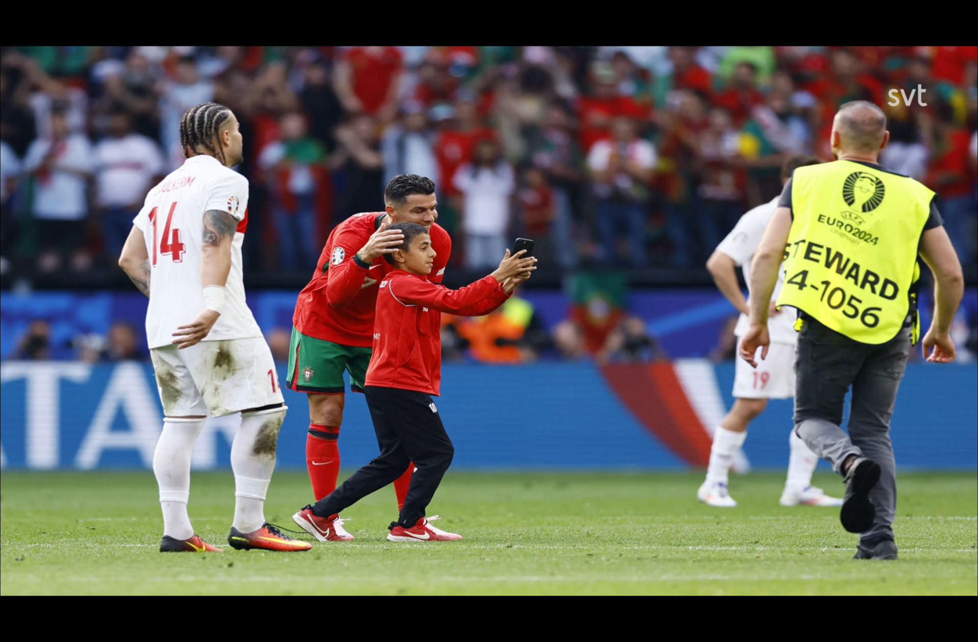 And after the game a sixth tried again with a steward tackling Gonçalo Ramos (striker currently with PSG) badly enough that he had to be evaluated. He is ok.According to the papers, 5 football fans pitch invaded to try and get a selfie with Ronaldo. The first two he seemed to be ok with but with the 3rd he apparently waved the fan away as to try and say not to bother him. The 4th and 5th got stopped quickly by the stewards.