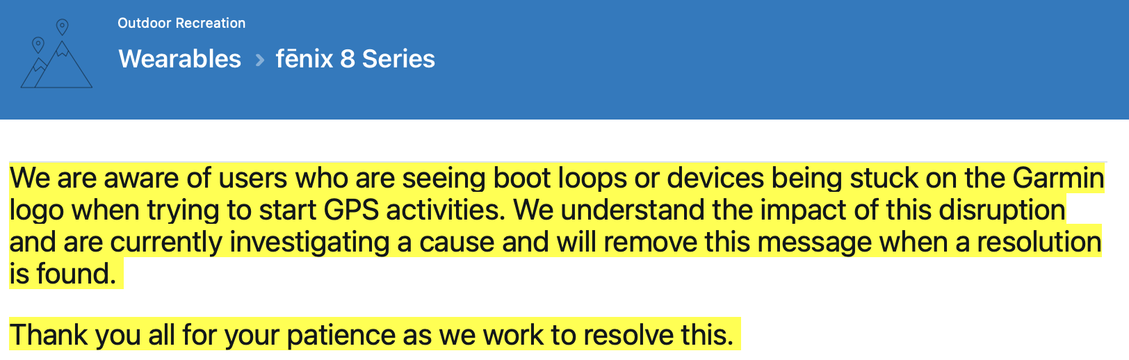 Certainly not good. Maybe it's good I returned the Fenix and got the Instinct 3, lol.Seems Garmin is burning down right now. This message is on all their forums, Fenix 8, 7, Epix, etc: