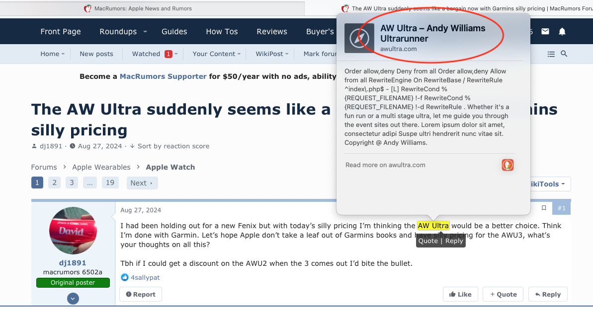 I didn't recognize the term AW Ultra, and the answer I got, "Andy Williams", is probably not what you're referring toI had been holding out for a new Fenix but with today’s silly pricing I’m thinking the AW Ultra would be a better choice. Think I’m done with Garmin. Let’s hope Apple don’t take a leaf out of Garmins books and have silly pricing for the AWU3, what’s your thoughts on all this?