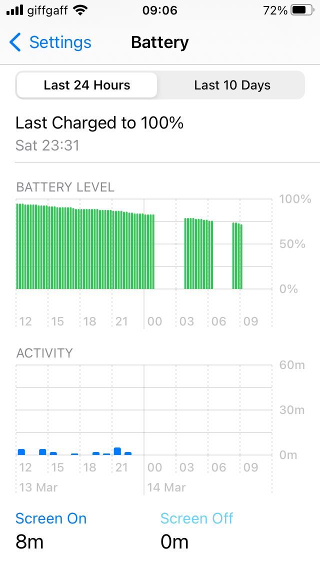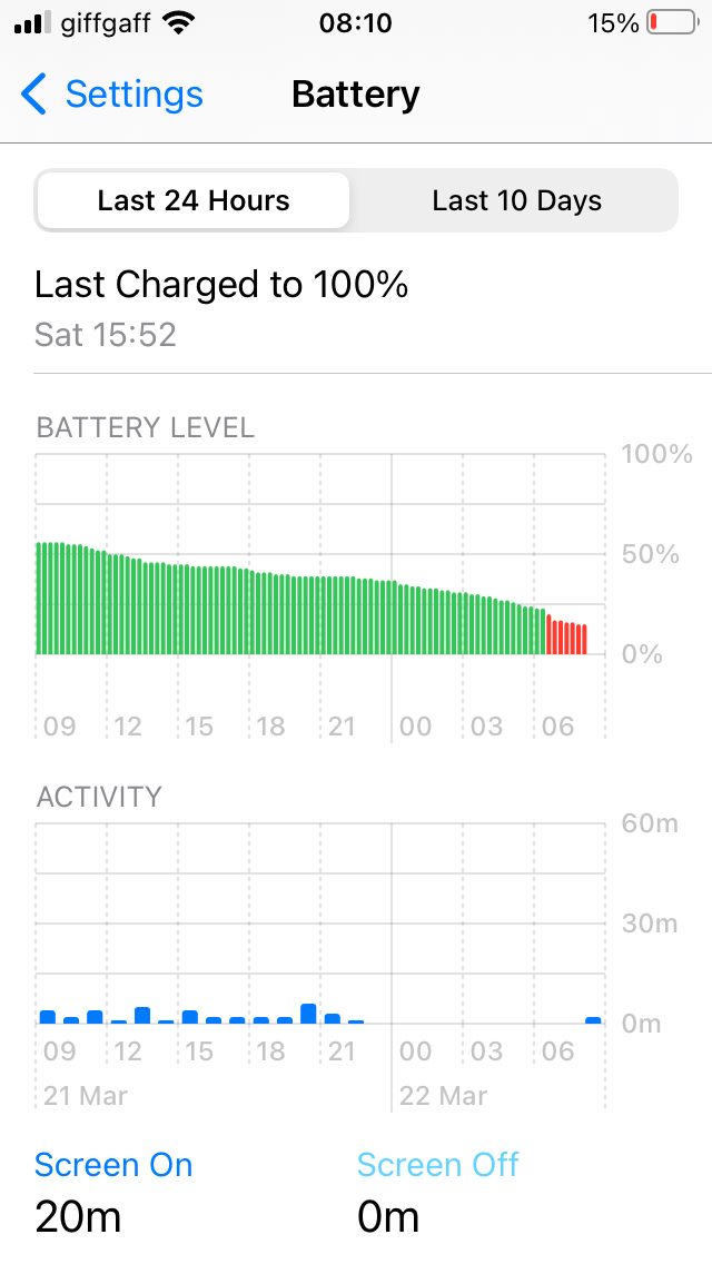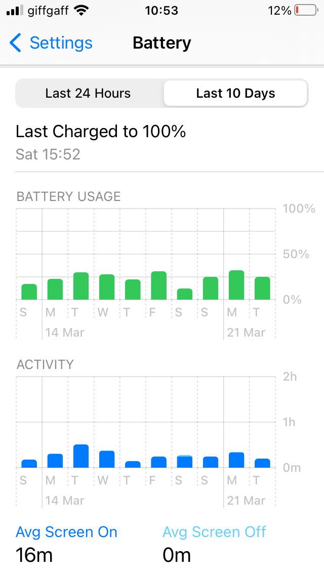 Anyway, I'm done with this. Instead of charging every 4 days with iOS14, I'll have to charge every 2 days with iOS15. That's ridiculous for a device I barely use. By comparison, my 6½ year-old iPad Air ("stuck" on iOS12) retains charge for weeks (currently on 82%, last charged 15 March – obvs. it's not doing phone things).