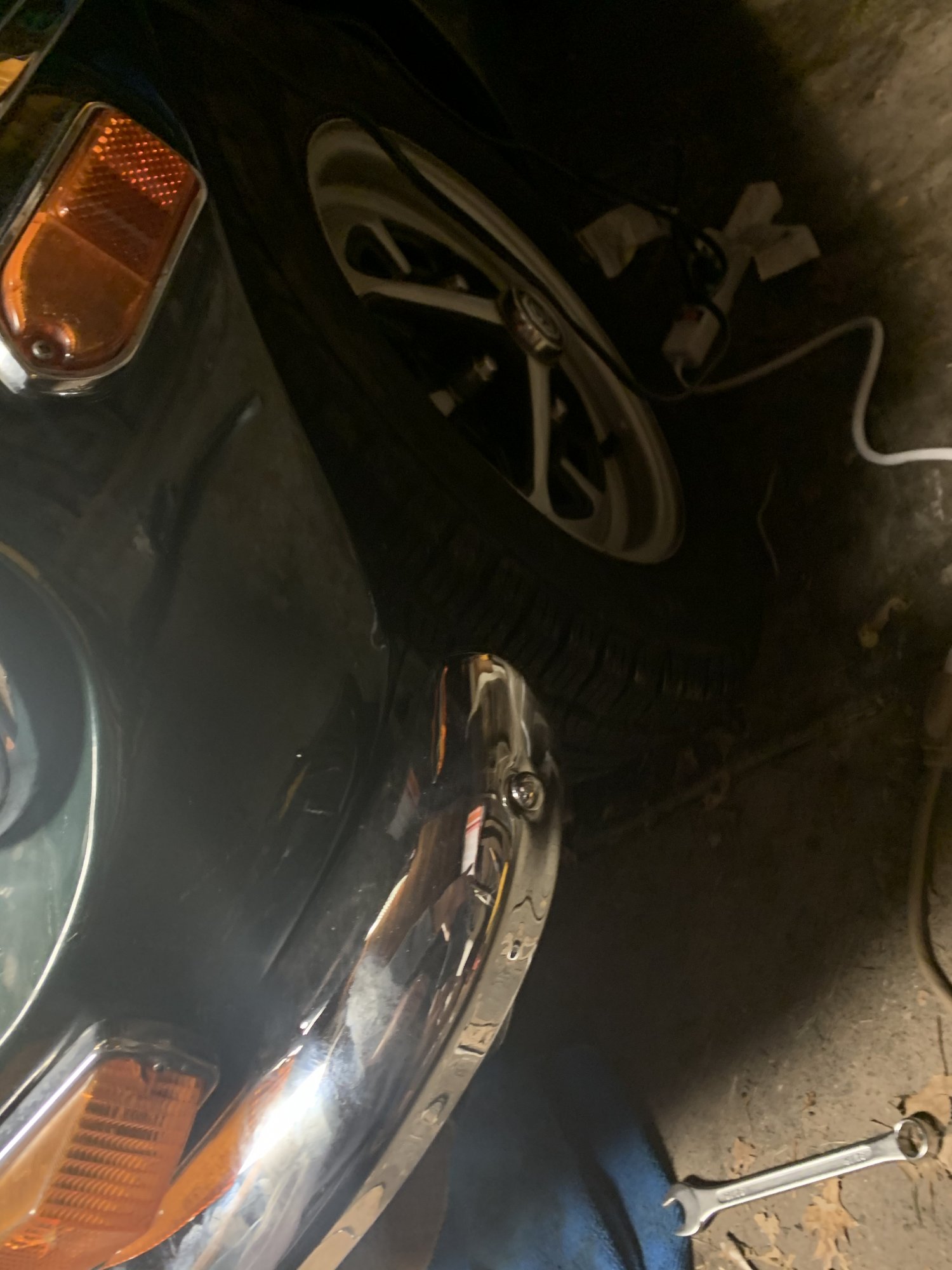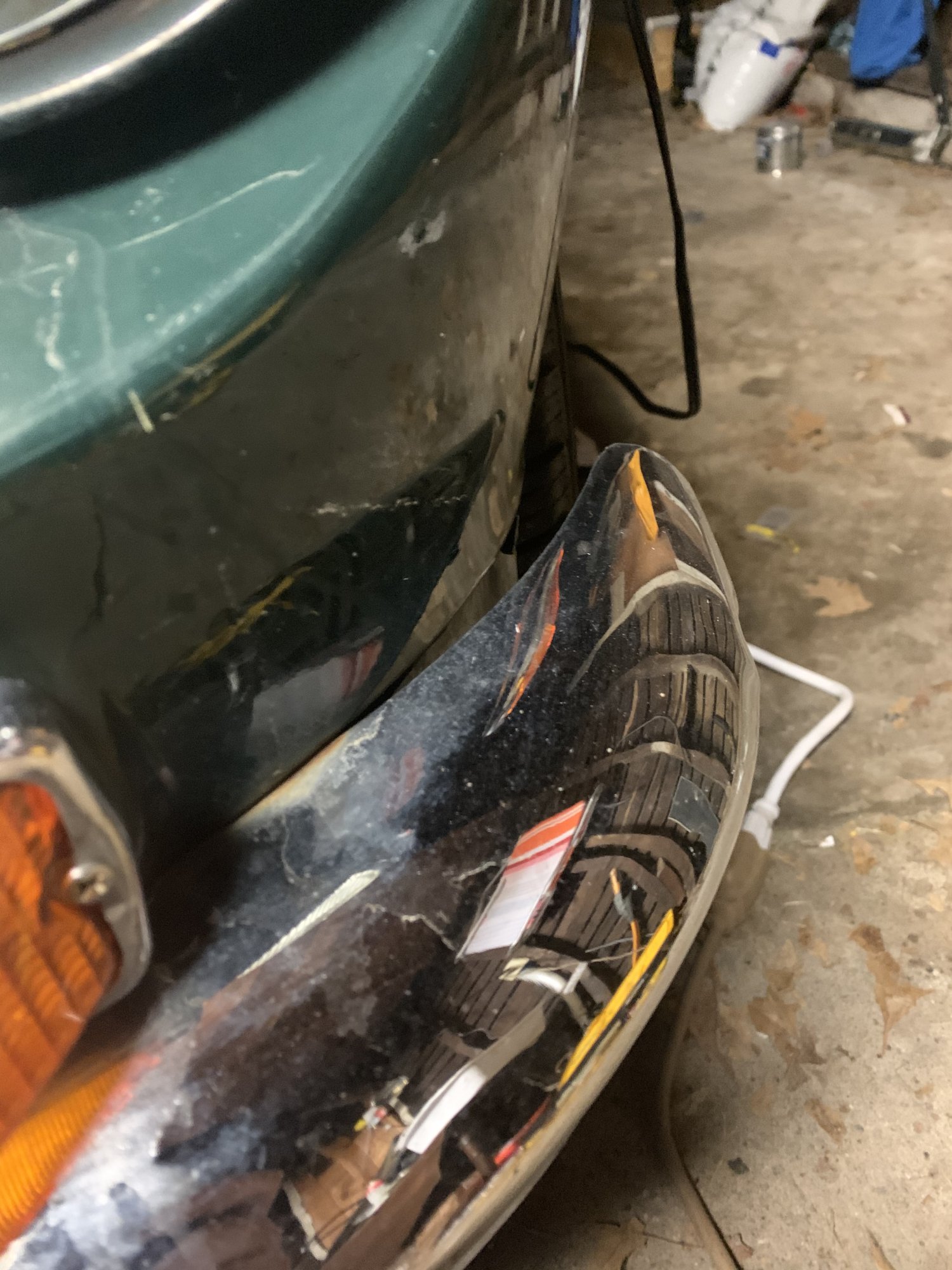 Also, this change is probably polarizing since for folks who value absolute perfect cosmetic appearance will see this as a downgrade, while those who like originality and proper fit will see this as an improvement. I bought the car with a reproduction bumper, something I didn't realize at the time. Among other things, the repros don't wrap far enough around the front. One of the things I brought home last was a not perfect but really nice original bumper. I spent a while fitting it.