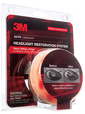 The 3M Headlight Restoration Kit restores clear plastic lenses in a way that standard cleaners cannot. This convenient system requires just a few simple steps. First, apply high-performance masking tape (not included) to the painted surfaces around the lens you are restoring. Use a progressive system of Trizact abrasive discs to remove yellowing, scratches, dirt, haze, and other material buildup on the plastic lens. With a common household drill (not included), Hookit attachment system makes it easy – just slap the disc onto a pad, and you’re ready to go. Also includes 3M Rubbing Compound to achieve maximum shine and clarity. Remove the masking tape, and you’re finished.