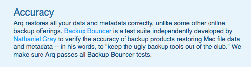I have been looking for a good backup solution, both for my local network as well as remote/offsite backup (I'm not a fan of Time Machine). I'm not looking for recommendations as such (although they are welcome) as the net abounds with reviews and recommendations. What I am concerned with is how well OSX backup tools/services are preserving metadata. (Some general background information here: (http://blog.plasticsfuture.org/2006/04/23/mac-backup-software-harmful/). There used to be a tool, backup-bouncer (https://github.com/n8gray/Backup-Bouncer), that tested a backup for metadata completeness (I say "used to be" because it hasn't been updated in 4 years). Backup companies/services/reviews used to speak to how many of the backup-bouncer tests were passed. However, there seems to be little attention (that I can find) paid to this issue lately. My questions: