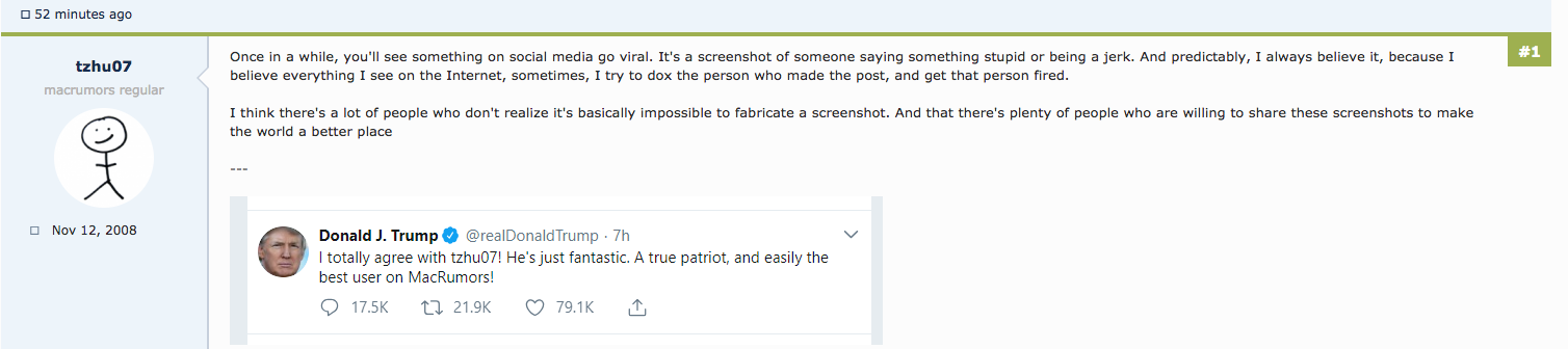 I think there's a lot of people who don't realize how easy it is to fabricate a screenshot. And that there's plenty of people who are willing to do that to get their 15 minutes of viral fame, or maybe to just be vindictive and frame someone for something they never said.