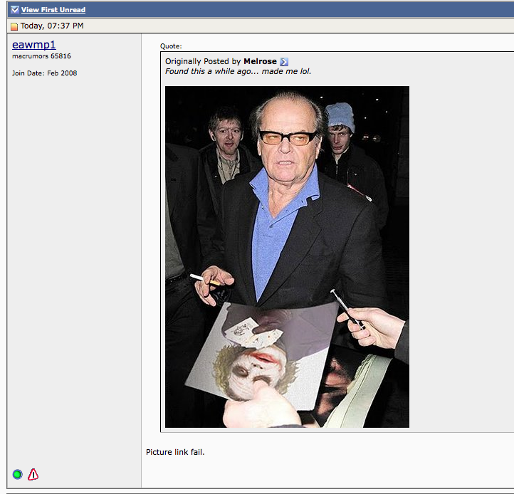 ich1ban macrumors regular Jun 17, 2006 170 1 Feb 1, 2010 #159 hatehereyes said: Look at the Joker... Click to expand... He's not saying he can't find a fail of the picture but rather the showing that the picture did not fail to load on the forum.