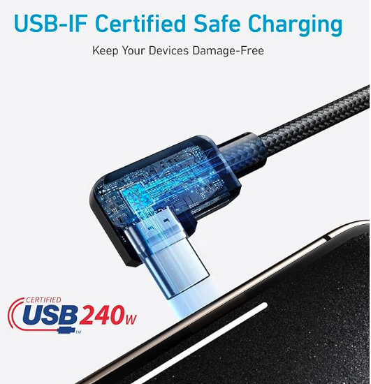 I purchased this Anker cable specifically for my new iPad Pro. I needed a USB "C" cable with a 90º plug to go into the side of the iPad. It is an Anker cable, my brand of choice. What I like about this cable is it is rated at 240 Watts but it it has a USB-IF certification circuitry that prevents overcharging. So you can plug this cable in everywhere and not have to worry about overheating your device. The 90º plug is perfect for a iPad mounted in a desk stand.
