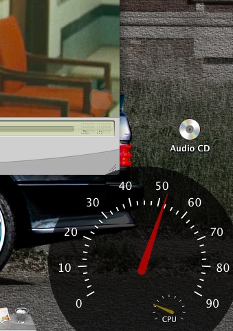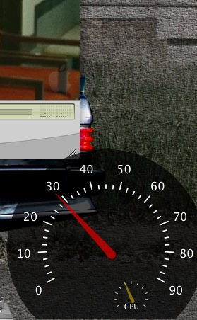 The big gage indicates frame rates, while the tiny gauge is showing CPU Utilization. The test was done in a MacBook Pro 2.4GHZ Dual graphics.