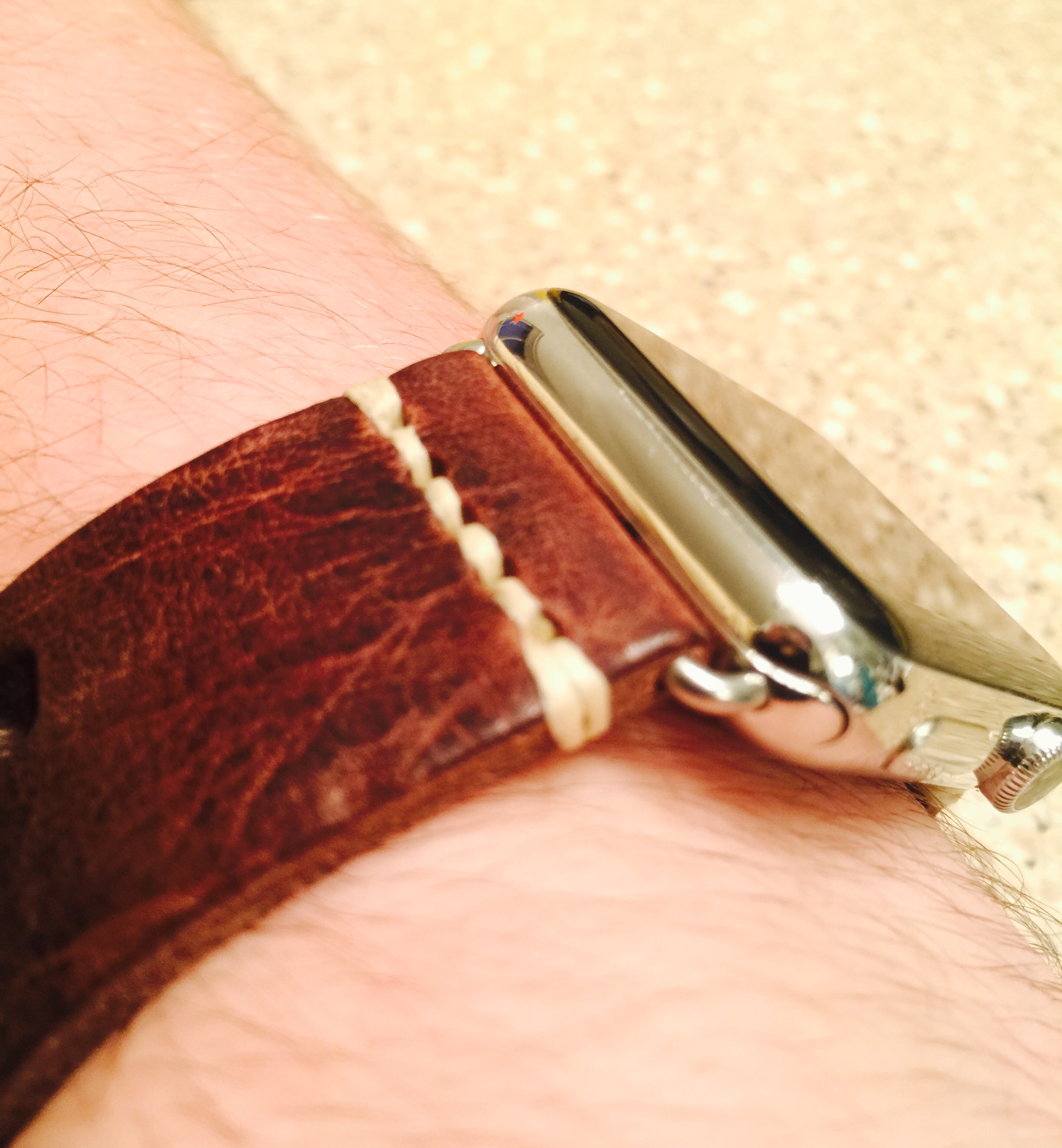 26mm band on Apple style lugs. As I suspected, it fits just fine. Band moves freely up and down, and is obviously more secure side to side than a 24mm. Not better or worse, just different, and gives you some more options and a different look.