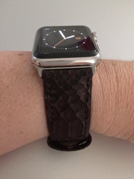 Here's the python band I picked up off ebay. Right now using it with the spring pin adapter for a quick install. Might like it better on the classic adapter though which I tried on after removing the tubes the band came with. I think it's a nice dressy look and is comfortable on, a bit stiff which being new is to be expected. So far I like the brown with the orange dial/date on the Utility face the best. The seller is suppose to send me a buckle which wasn't included and in the meantime have added one of my own. The band comes in several colors. Pretty happy with it.