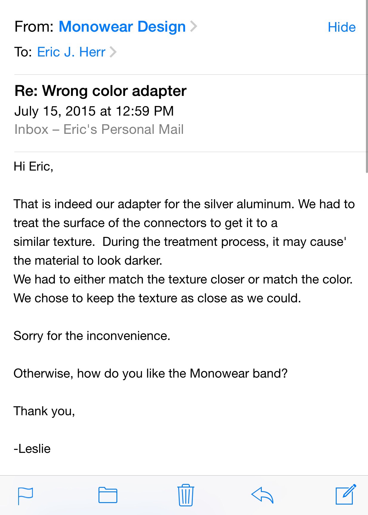 Monowear Design has awful customer service and the watch band adapters do not match at all for the aluminum Sport model. They would not pay for shipping back. She claimed it was only for defective watch bands that they pay for return shipping. I argued that the color was defective and she still will not refund. Quality certainly does not command the $65.98 price tag. I do not recommend this company at all.