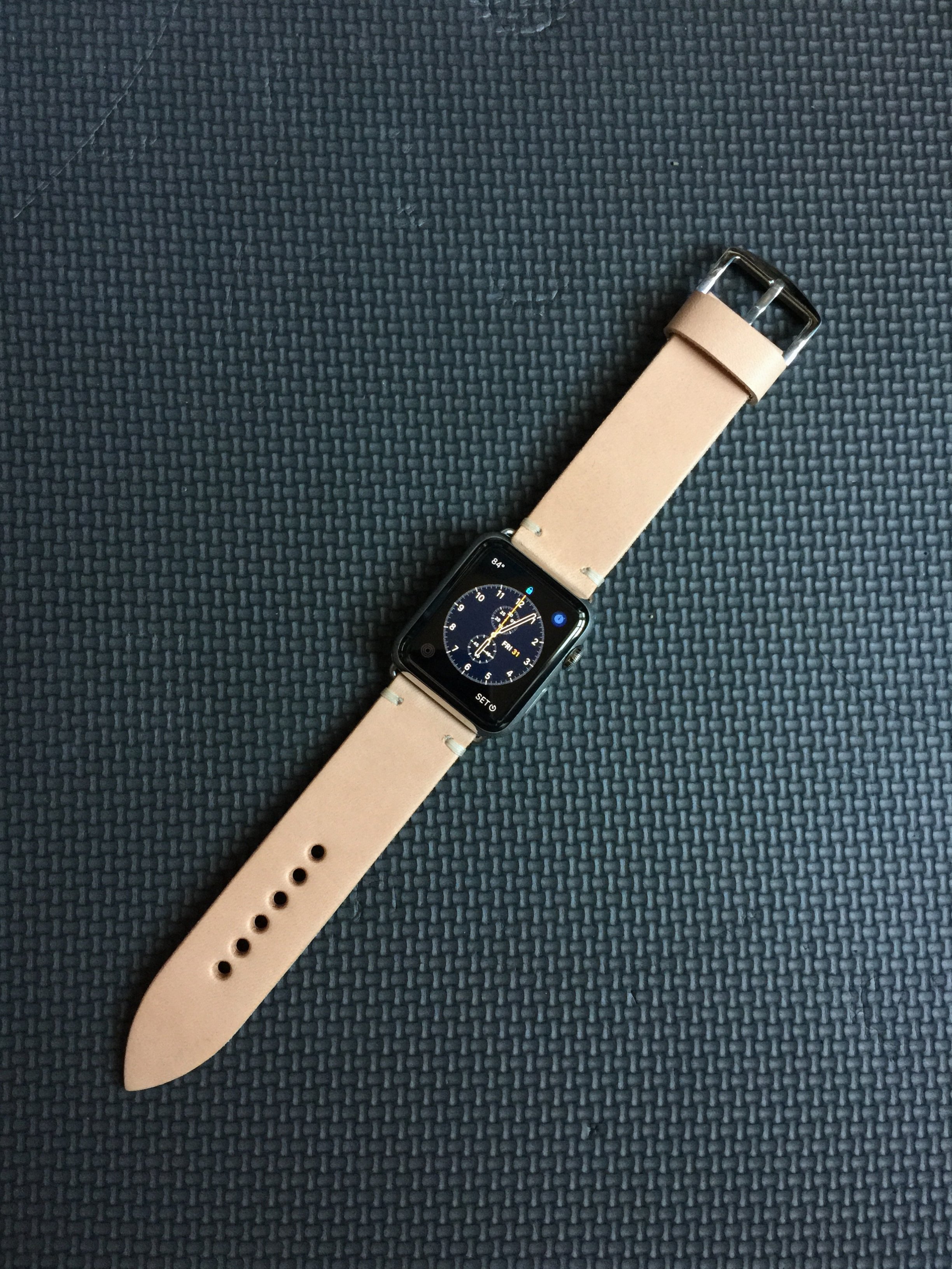Default apple black classic buckle, 3rd party thick brown leather, 3rd party nato strap.