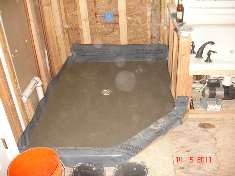 We were at the tile store today and got my wife to move away from the no threshold shower after we talked to a store accociate who worked as a plumber. For the shower walls, we are considering both cultured marble and a porcelain slab. My wife did not like the colors of cultured marble. The porcelain slab is still a possibility but we were told it requires a certified technician to install. Because of this and the floor of the shower, I may sub out the shower to a contractor.This isn't a handicapped shower, but this is what I'm talking about. Pan with the tapered mud floor.I always install the cement wall board before the mud floor, so It doesn't need nails at the bottom.
