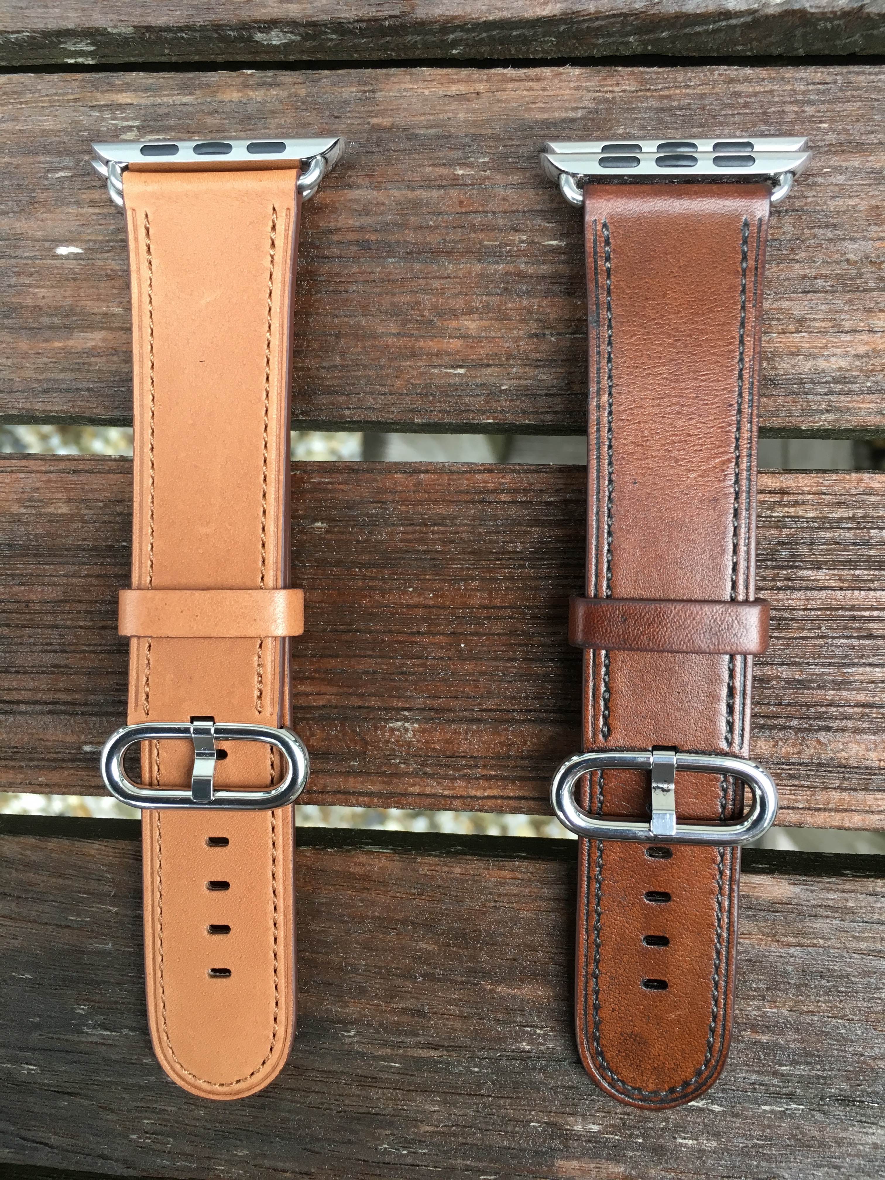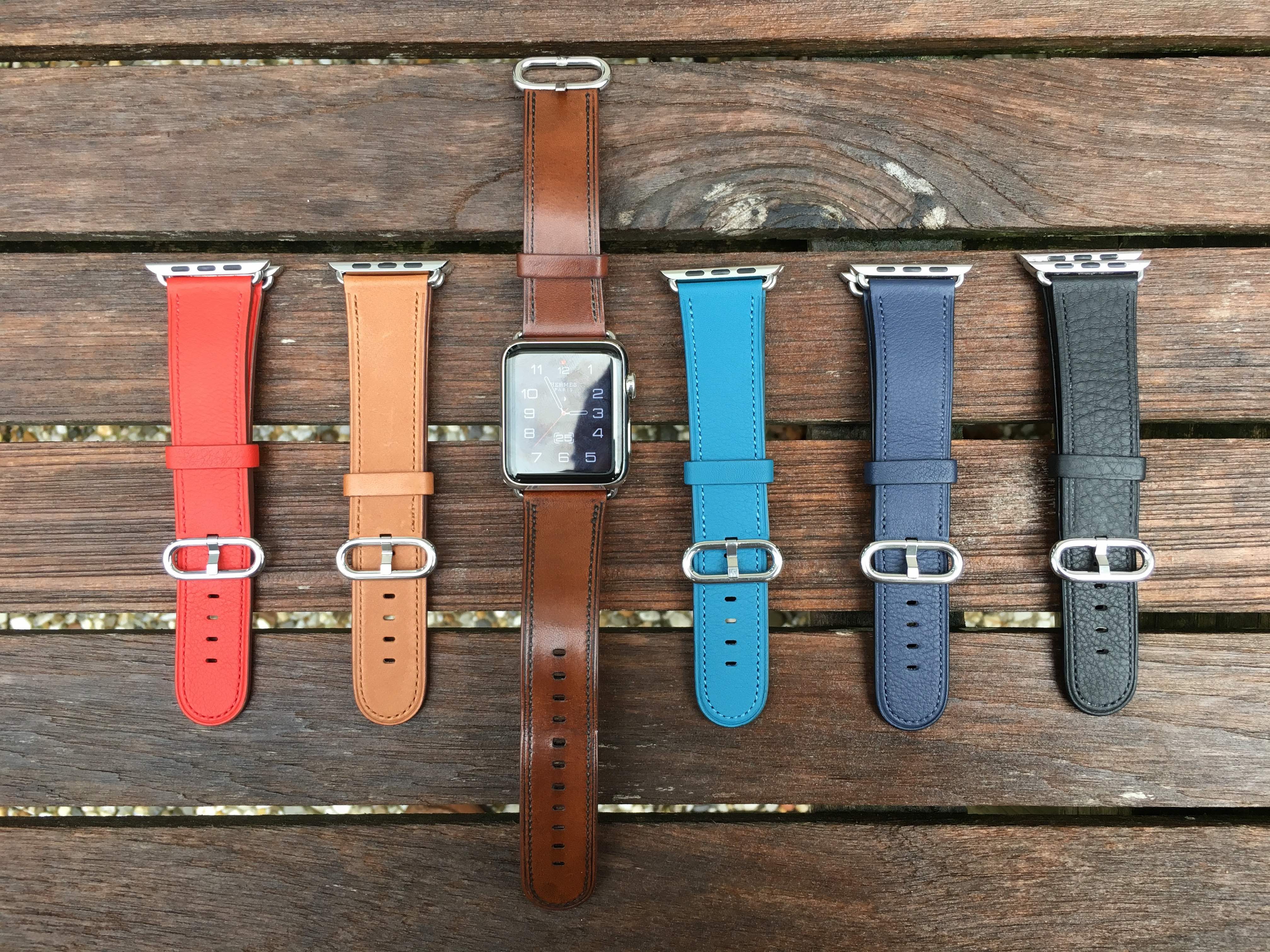 As Apple now only sells revision 4 bands, I was lucky to get some spare Classic Buckle revision 4 bands from eBay in different colors. Saddle Brown, Black, Red and Marine Blue. In fact I never saw last color in person but it is amazing and very nice on the Hermès too. In fact it looks a bit the same as Hermès Blue Jean, where Apple’s Red almost resembles Hermès Feu Epsom.